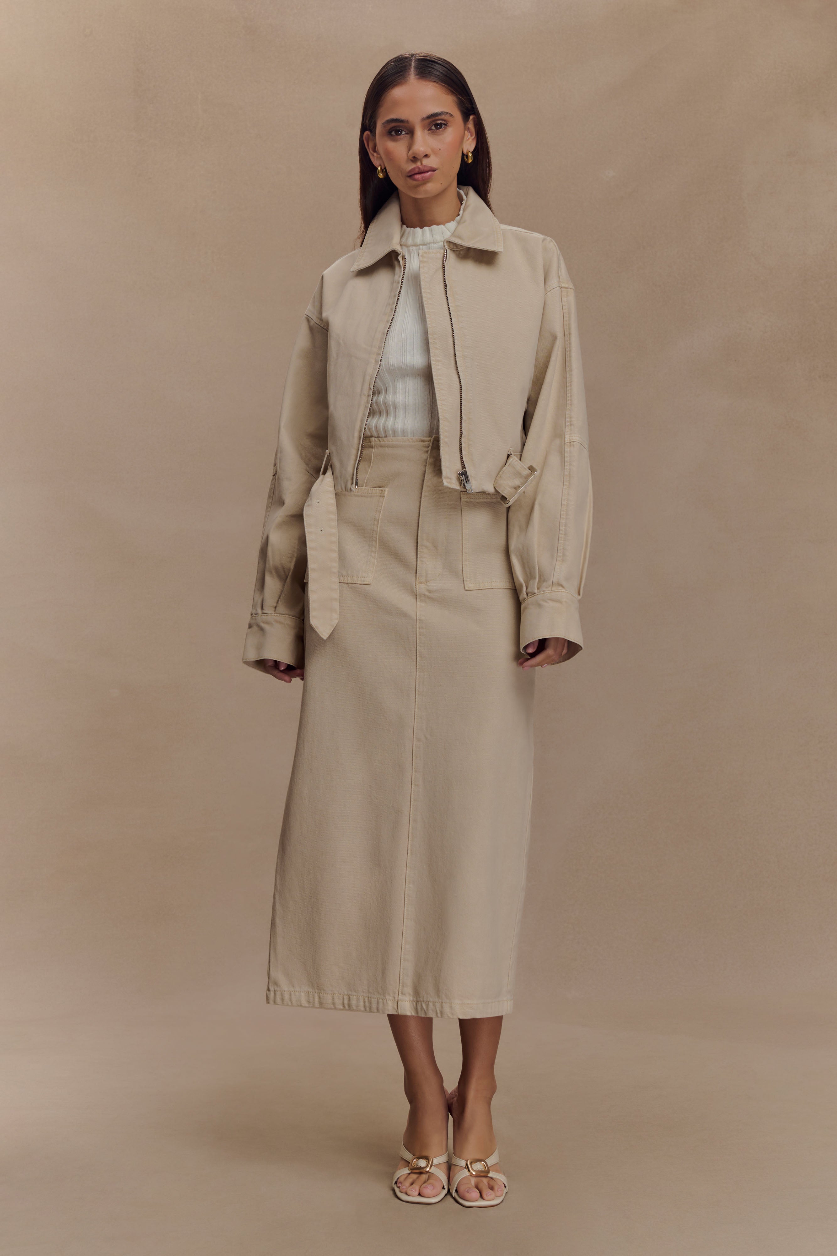 The FALLON Cropped Denim Jacket is your go-to layering piece with a fresh edge. Featuring a collared neckline, front zip opening, and long sleeves, this unlined jacket is elevated by a waist belt and buckle with functional belt loops for a cinched silhouette. A slightly gathered hem adds a soft touch to its structured shape, making it the perfect blend of utility and style. Pair with the Fallon Denim Midi Skirt for a coordinated denim look that’s effortlessly modern.