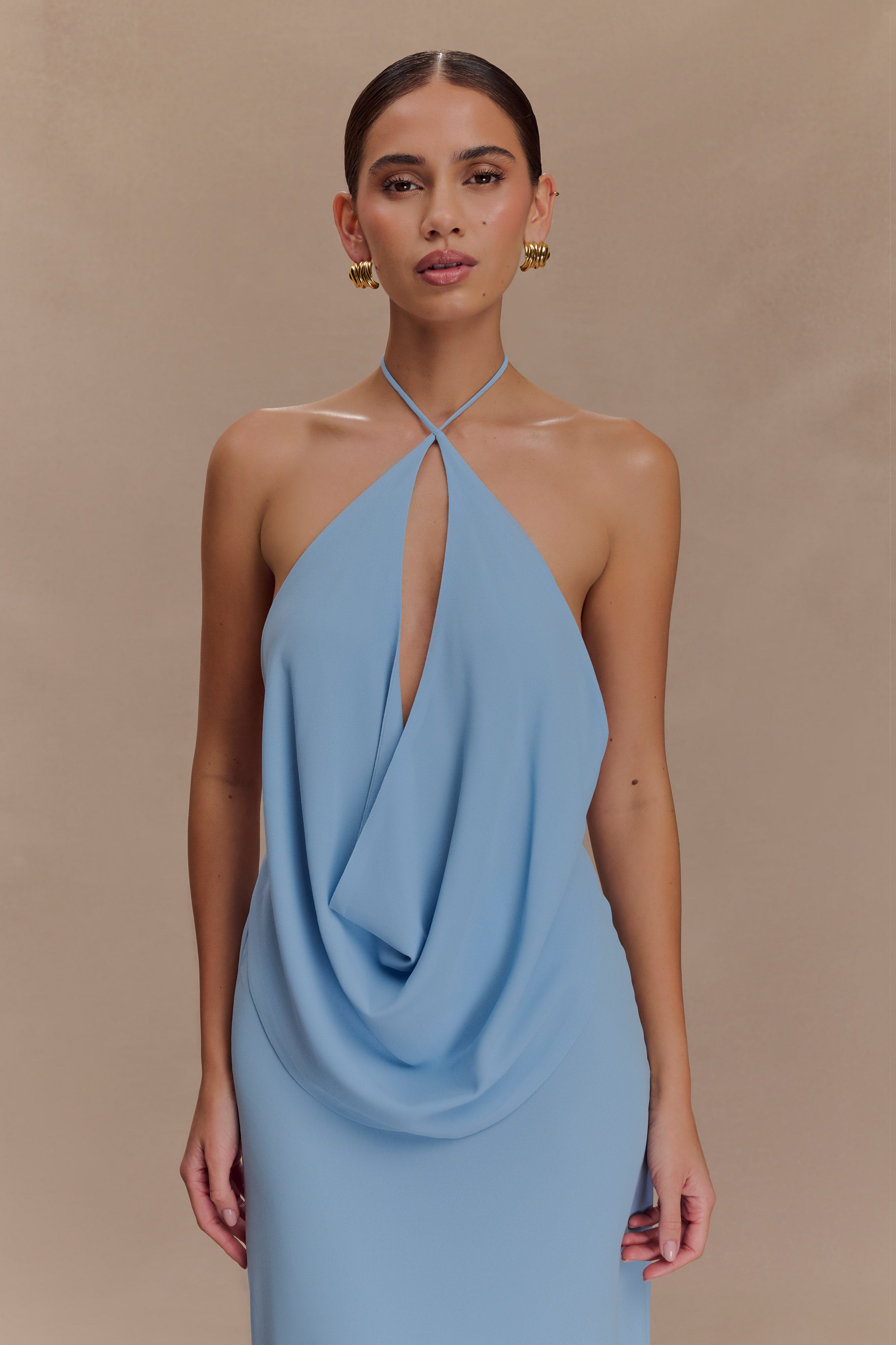 The KATALINA Chiffon Cowl Halter Top is a lightweight, fluid piece designed to elevate warm-weather styling. Featuring a cross-over halter neckline and a deep front cowl, this unlined top drapes beautifully along the body with a slight cowl detail at the back and a softly curved hem. Perfect for day-to-night dressing, pair it with the Katalina Chiffon Maxi Skirt for a coordinated look that blends elegance with ease.
