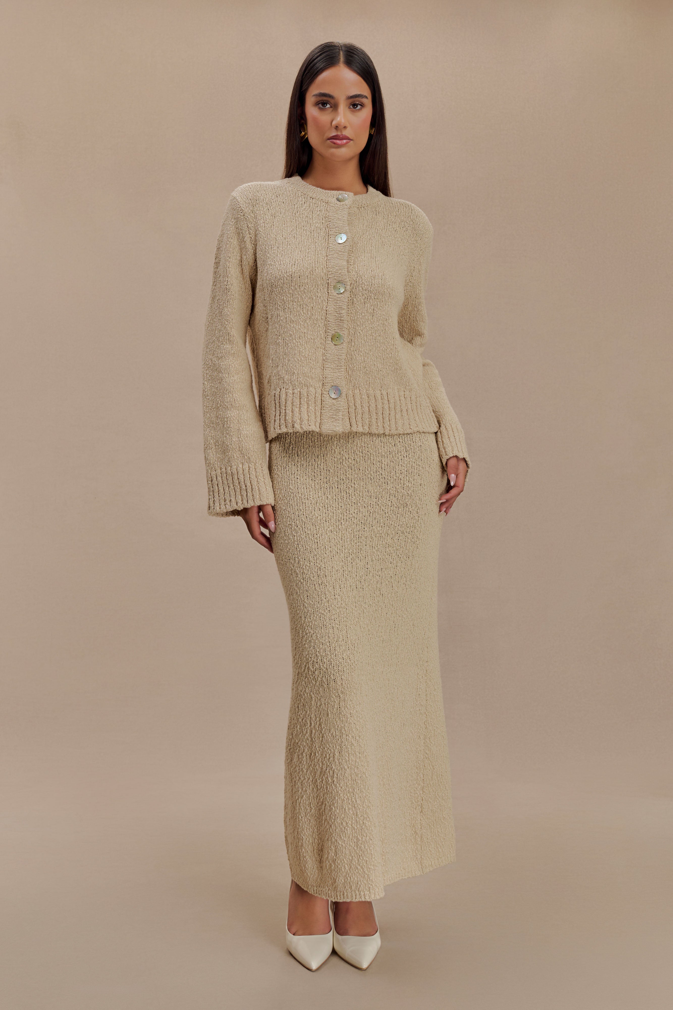 The MOIRA Oversized Boucle Cardigan is the epitome of cozy chic. Featuring a round neckline and drop shoulders, this cardigan offers a relaxed and comfortable fit. The straight sleeves and functional centre front button closure add to its classic appeal. Crafted from soft boucle knit fabric, this oversized cardigan provides warmth and texture, making it a perfect layering piece for any outfit. Whether paired with jeans for a casual look or the Moira Boucle Maxi Skirt for added elegance, the Moira Oversized Boucle Cardigan is a versatile and stylish addition to your wardrobe.